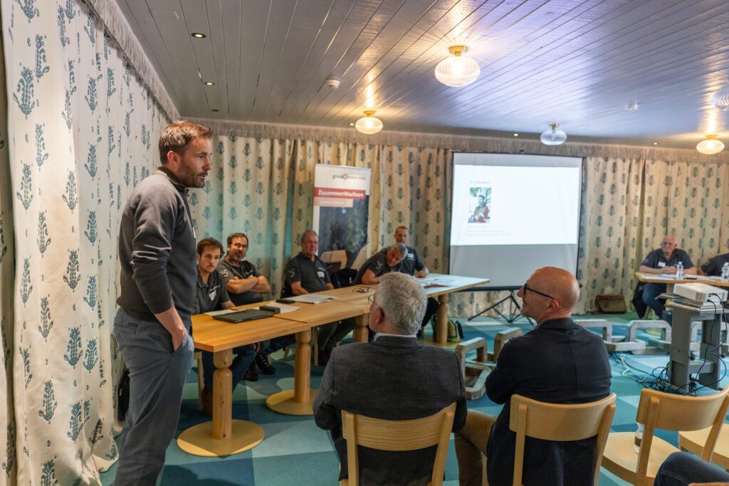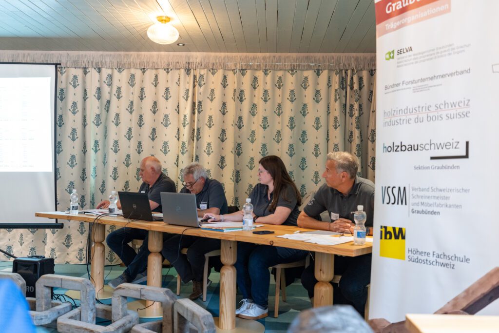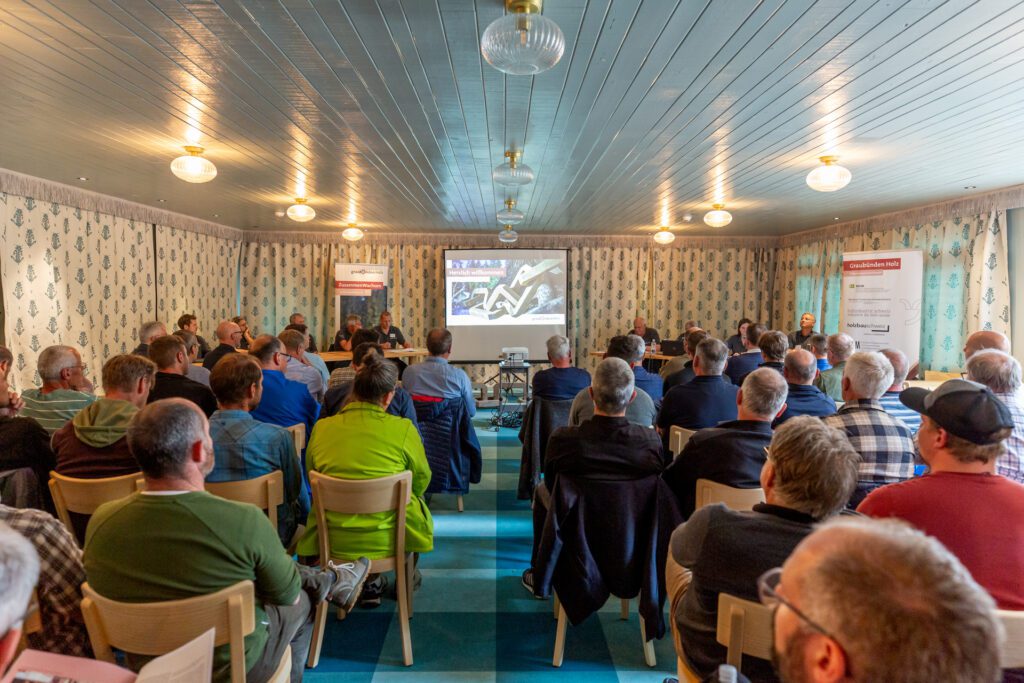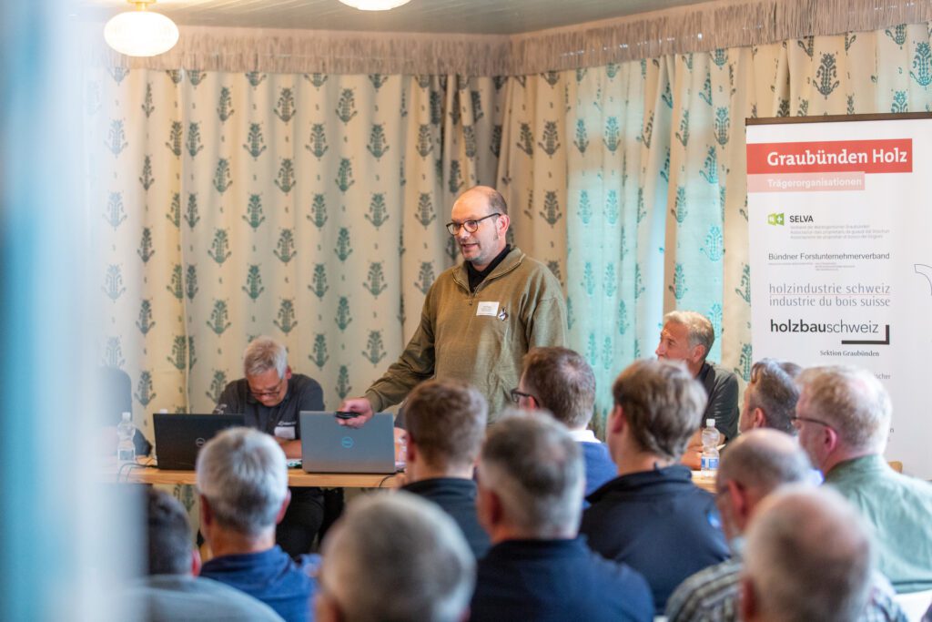 Danach rückten zentrale Themen der Branche und ihrer Zukunft ins Zentrum: Marcel Lerch, Geschäftsführer von Graubünden Holz, präsentierte das Referat «Schulterschluss Holzwirtschaft», ein Vorhaben, das die Grundlage für eine engere Kooperation und zukunftsfähige Entwicklung der Bündner Holzwirtschaft schaffen soll.