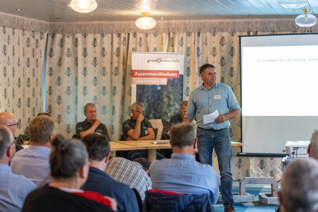 Anschliessend richtete Urban Maissen, Kantonsförster des Amts für Wald und Naturgefahren Graubünden, sein Grusswort an die Versammlung. Er betonte die Bedeutung der lokalen Wald- und Holzwirtschaft für die Regionen und hob die Wichtigkeit der Zusammenarbeit und der gemeinsamen Umsetzung neuer Projekte hervor. In diesem Zusammenhang verwies er auch auf die neue Leistungsvereinbarung mit Graubünden Holz, welche vier zentrale Strategieziele in den Mittelpunkt stellt.