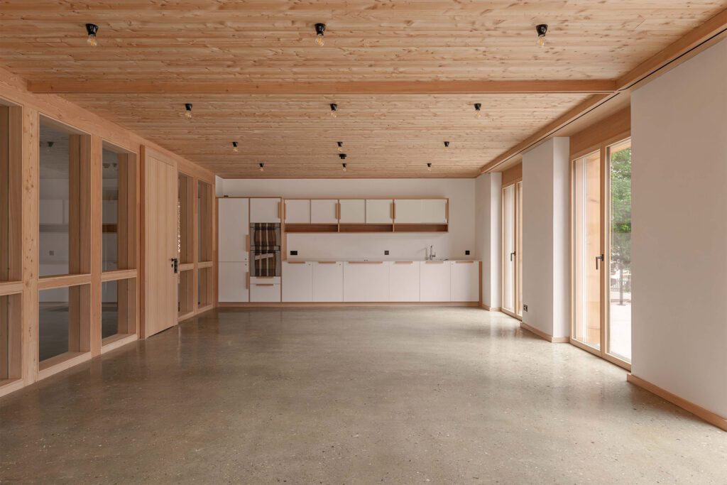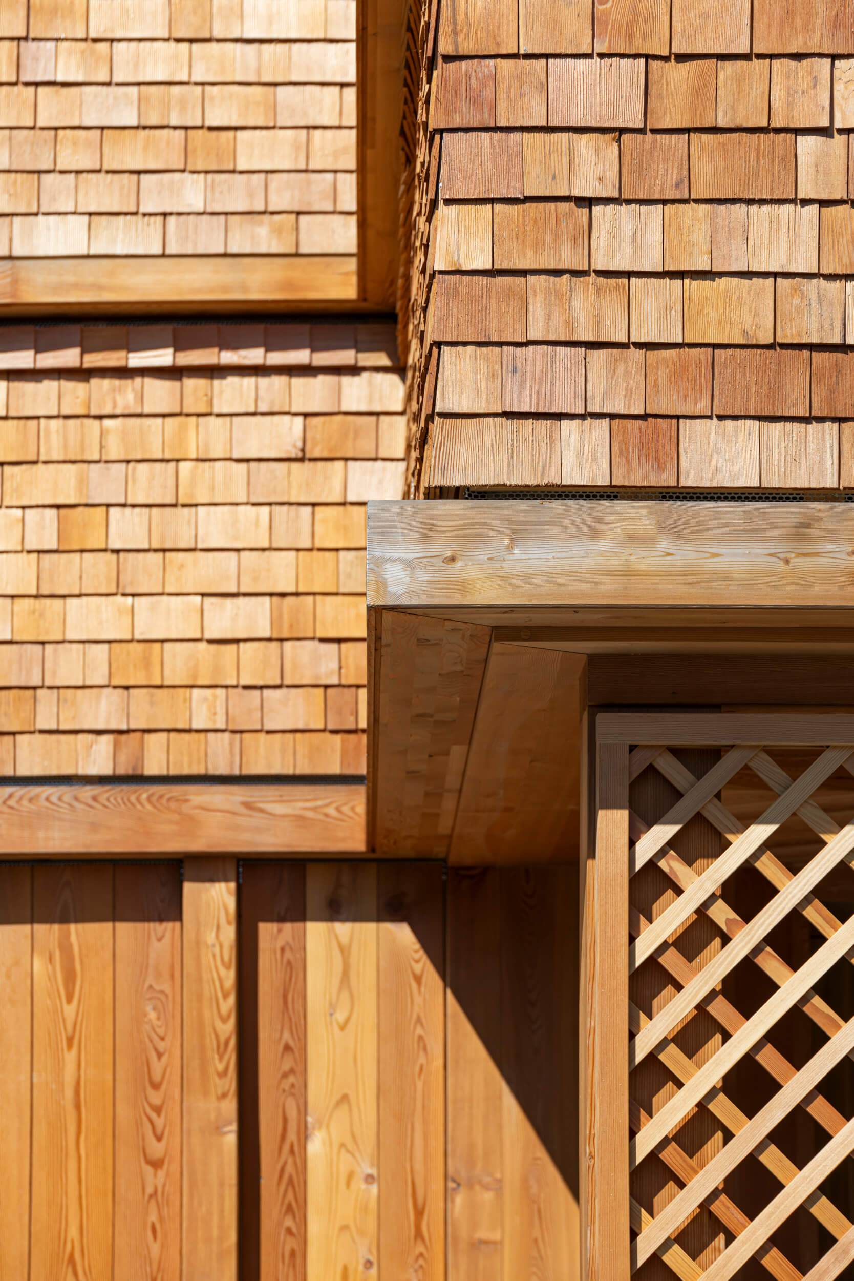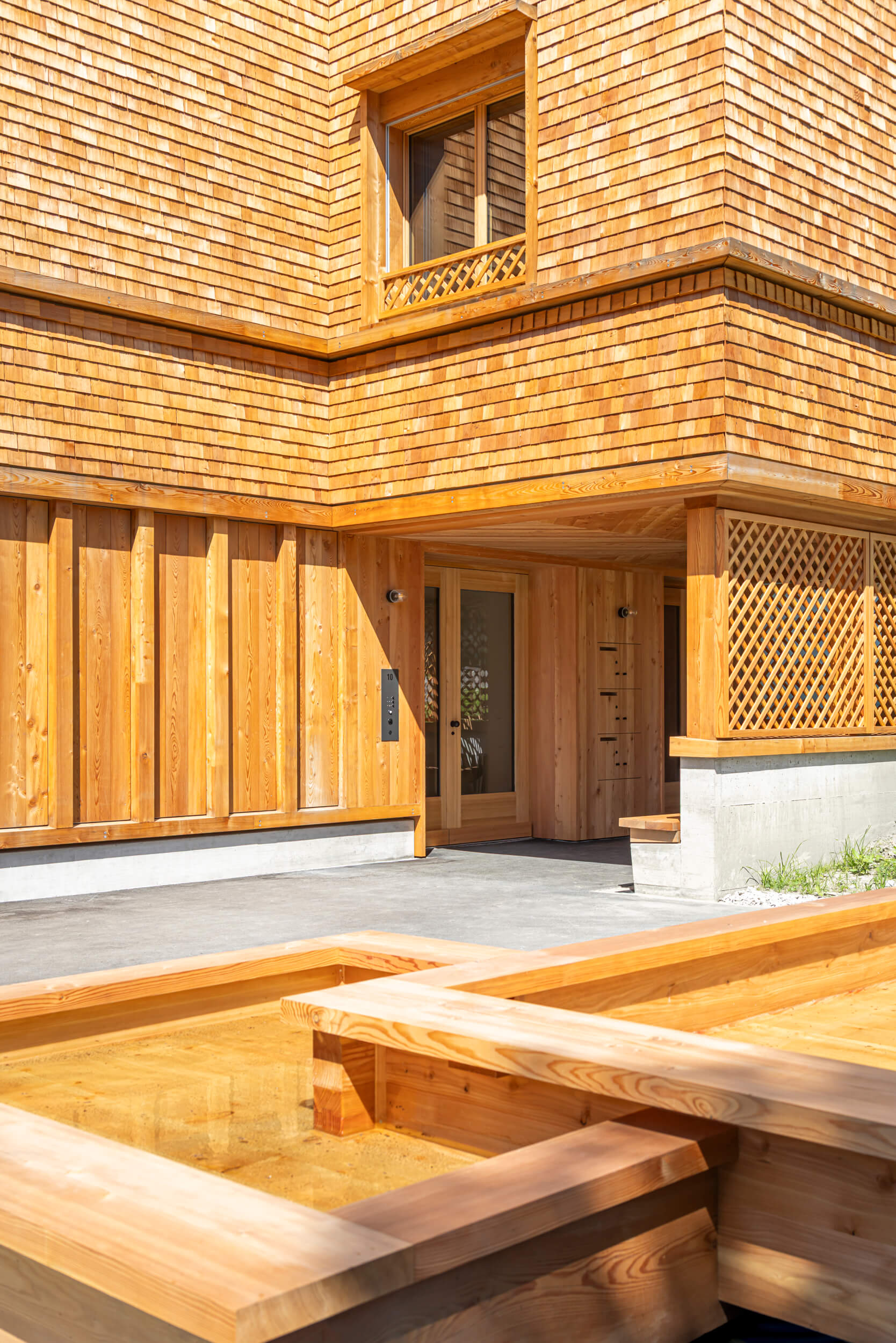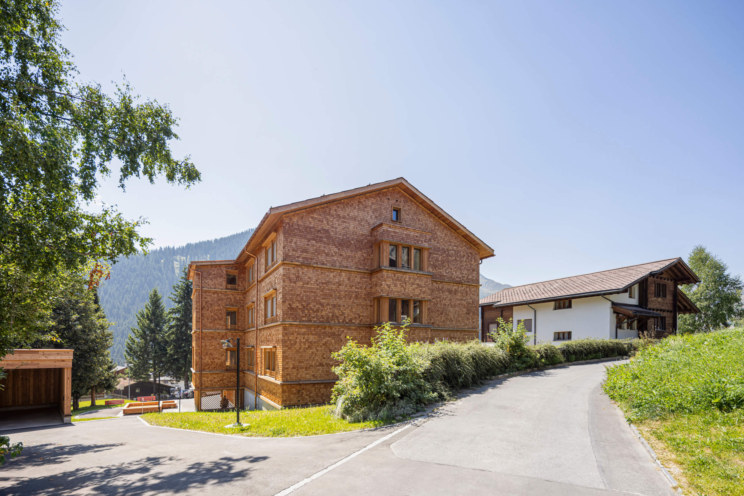 Die vorgefertigte Holzkonstruktion der Wände und Decken besteht aus lokalem Schnittholz, und die Fassade wird mit Lärchenschindeln aus regionalem Holz verkleidet. Dadurch werden nicht nur die Transportwege verkürzt, sondern auch das einheimische Handwerk gestärkt, während gleichzeitig die Emissionen und Umweltbelastungen auf ein Minimum reduziert werden.