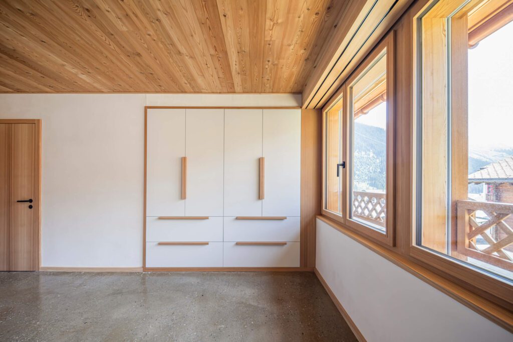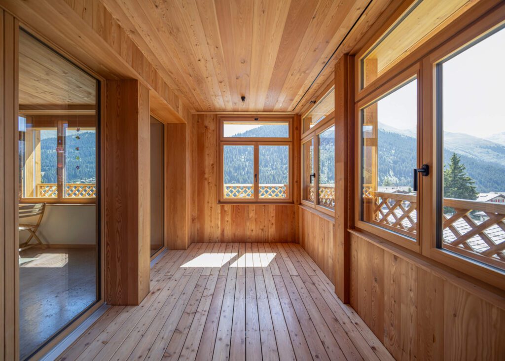 Ausgezeichnet wurden die Bodenkonstruktion, Fassade inkl. Unterkonstruktion, Deckentäfer in Lärche sowie Fenster und Fensterstöcke mit dem Schweizer Holz Label. Das Label Schweizer Holz steht für Regionalität, Qualität und gelebte Nachhaltigkeit. Es garantiert, dass der eingesetzte Rohstoff aus unseren Wäldern stammt, kurze Transportwege eingehalten und die Wertschöpfung in der Region gestärkt wird.
