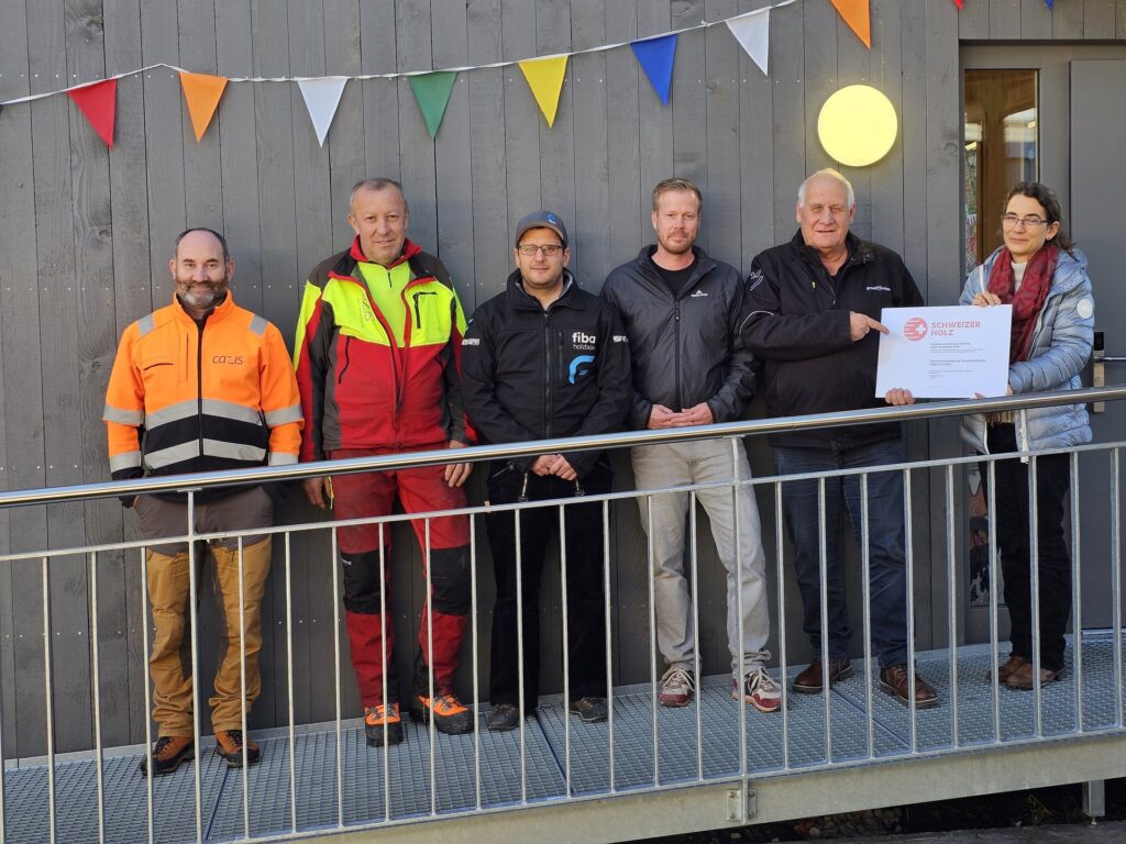 v.l.n.r.: Kenneth Danuser (Forst- und Werkbetrieb Cazis), Stefan Klekar (Gemeindesägerei Dalin), Joos Baumann (FIBA Holzbau AG, Thusis), Peter Riederer (INVIAS, Maienfeld), Marcel Lerch (Graubünden Holz), Pascale Steiner (Gemeinde Cazis)